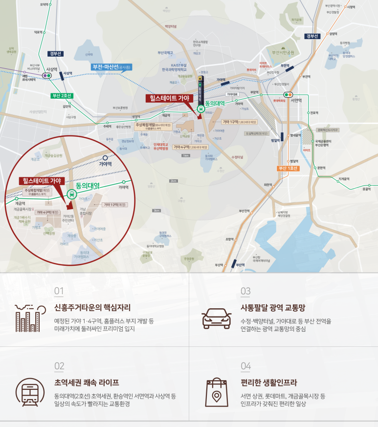 차량을 이용하는 경우에도 가야대로, 수정터널, 백양터널 등 주요 도로망을 통해 부산 전역으로 이동이 가능합니다. 특정 지역으로만 동선이 몰리지 않고, 여러 방향으로 선택지가 열려 있어 이동 스트레스가 상대적으로 적은 편입니다. 도심 가까이에 위치하면서도 과도한 소음이나 혼잡에서 한 걸음 떨어진 입지라는 점이 생활 측면에서는 장점으로 다가옵니다.
