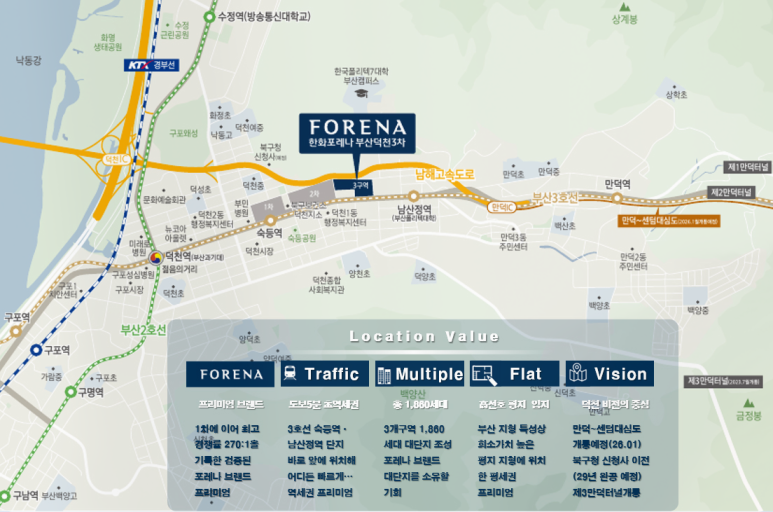 한화포레나 부산덕천 3차는 덕천 재건축 사업의 마지막 단계이자, 1,860세대 포레나타운을 완성하는 핵심 단지입니다. 초역세권 교통, 평지 중심 입지, 풍부한 생활 인프라와 자연환경, 그리고 다양한 도시계획이 함께 어우러지며 덕천의 현재와 미래를 동시에 담아낸 주거 공간으로 볼 수 있습니다.