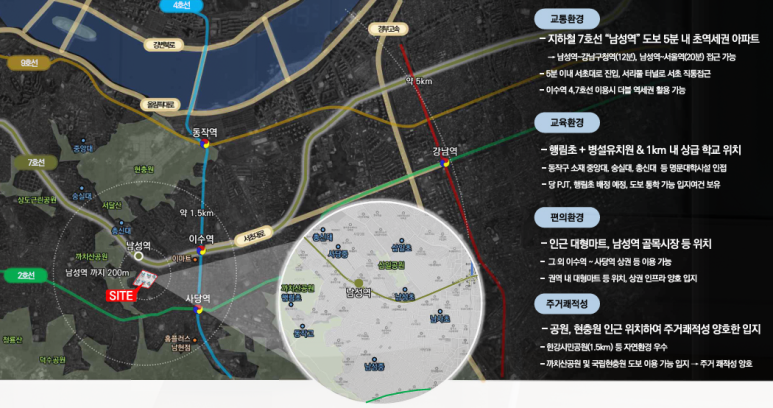 우선 교통 환경이 상당히 뛰어난 편입니다. 지하철 7호선 남성역이 도보 5분이면 도착할 수 있는 거리라 출퇴근이나 일상 이동 모두 부담이 적습니다. 남성역에서 강남구청역까지 약 12분, 서울역까지 약 20분 전후로 도달할 수 있어 강남권과 도심 접근성이 모두 좋습니다. 여기에 도보·버스 환승을 통해 2호선과 4호선을 이용할 수 있는 이수역이 약 1.5km 거리에 위치해, 대중교통 선택지가 더 넓어지는 효과가 있습니다. 차량 이동도 동작대로, 사당로, 올림픽대로가 가깝기 때문에 어느 방향으로 이동해도 접근성이 무난하며, 사리풀터널을 이용하면 강남 방면으로 이동하는 시간이 한층 더 단축됩니다.